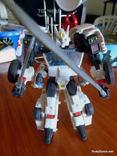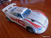 His vehicle mode is a nice little car that looks pretty amazing. Apar from the seam in his hood and such, for the most part he's a nicely solid vehicle and he's not too annoying to transform. I love how the various weapons and other odds and ends tuck back nicely into his vehicle mode, leaving you with a pretty good car to play with. And he looks like a rather serious racer that would give any Autbot a serious run for his money in a race (despite a Speed rating of 6). Thus is makes sense that they eventually used this same mold to create a Blurr figure.