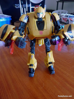 His top-heavy design is a bit of a posing nightmare and his chicken legs don't exactly give you a lot of comfort once you start positioning him. And while I was impressed at how you eventually form said feet when coming from his vehicle mode, his 4/5 transformation difficulty was more annoying than fulfilling on the whole (I'll address this at length shortly). At least his face is nicely reminiscent of his appearance in the G1 cartoon, and thus staring into those deep blue eyes of his helps reassure you that this is still good old Bumblebee. With energy blades.