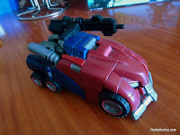 We naturally begin with Cybertronian Optimus Prime, he is a pretty solid figure with a wee bit more moving parts than I'd like. This figure was given a transformation difficulty rating of 4/5 by Hasbro with good reason - he has all these little bits hanging out that really get in the way of transformation and need to be positioned just right depending on at which step in the process you're at.