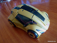 When you do manage to wrestle Bumblebee back into vehicle mode, it feels like you're playing with some complex Chinese puzzle with a million moving parts. What's worse, a lot of the needed alignments are highly precise and thus if you forget to bend his legs just so or to position his arms like that, he will never become a solid vehicle. Unless you get him transformed precisely right, you will constantly have his innards peeking out between the cracks, no matter how many times you try to ease the various interlocking bits into place. I've spent a fair amount of time with this figure and I still can't get it perfectly right on the first try.