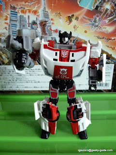 Now Red Alert is another redeco of the popular Sunstreaker / Sideswipe mold from the Universe toyline. And this is only fitting since the G1 version of Red Alert had also been a similar redeco of the Sideswipe mold and such. Similar to the Henkei! Henkei! version of this character, he instead has a G1-accurate black head (versus the cartoon red) and a rather quirky accessory.