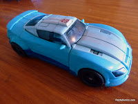 His vehicle mode is essentially a race car in his signature blue paint job, although the paint used has a tendency to feel a bit dull at times. It's hard to describe but for longer term collectors you'll recognize this as the pain that seems to attract dirt like a magnet and thus seems to stain over time.