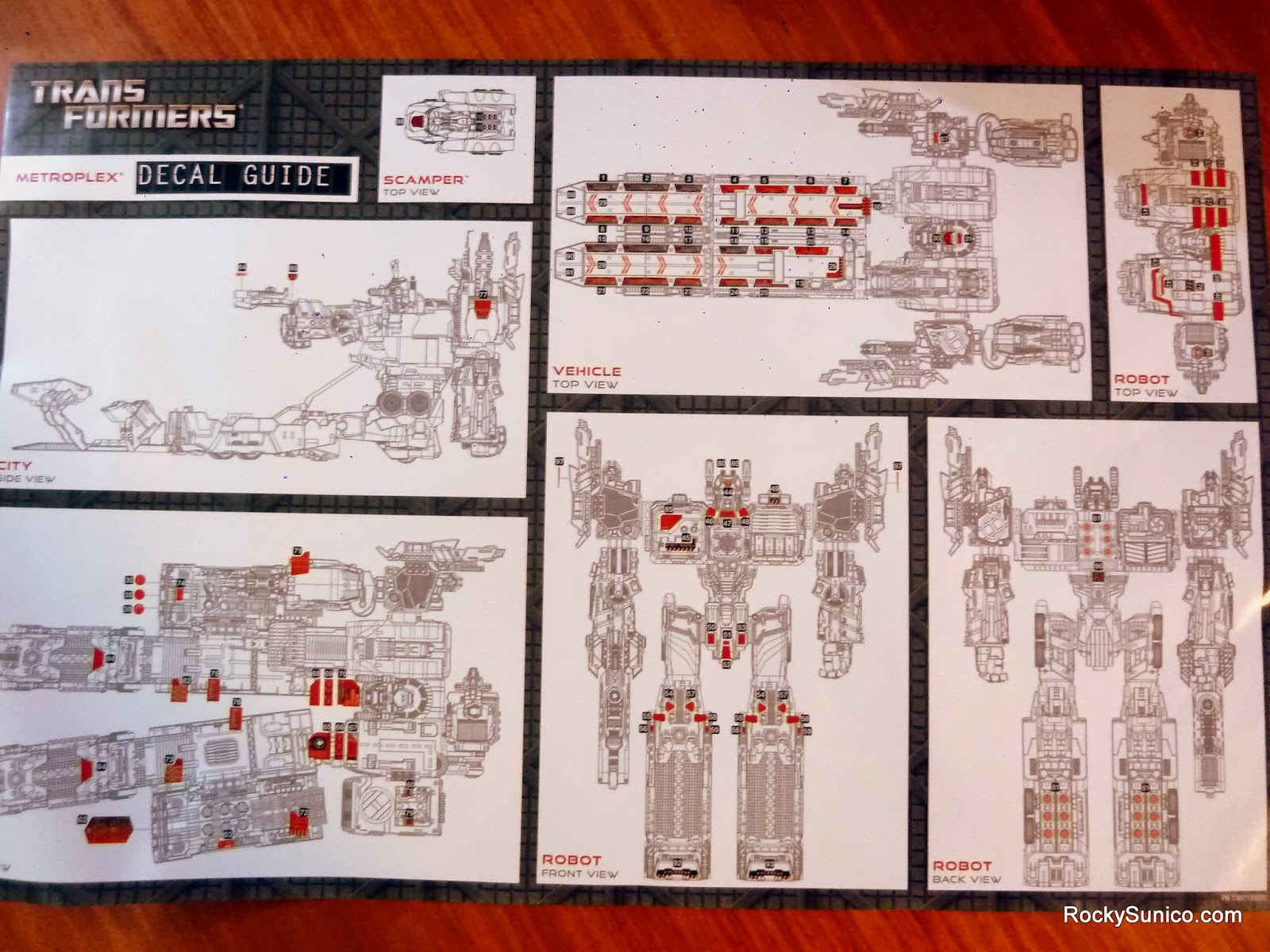 Metroplex still has over 100 stickers to apply and the maddening decal guide is only decently helpful. Things to remember include (1) some production error has accidentally swapped stickers 31 and 77 - be guided accordingly. (2) The gray stickers that go on his shoulders will inevitably overlap with the rotation disc for his head - you'll need some tools to either trim the sticker or find a way to squeeze it in between the disc and his shoulder. (3) The stickers that are to be applied in his base mode are hard to understand based on the guide - study the insides of his leg units to figure out where they go.